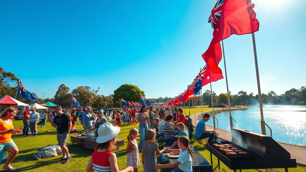 Australia Day, observed every January 26, commemorates the arrival of the First Fleet in 1788 and showcases the nation’s diversity and history. It’s a day for celebrations like community gatherings, fireworks, beaches, barbecues, and cultural performances. However, it’s also a complex day for Indigenous Australians, known as Invasion Day, highlighting issues of colonization and reconciliation. To understand how Australians honor their national identity and reflect on the past, keep exploring the significance behind the celebrations.