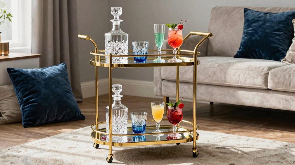 Having dedicated serving sets and bar carts means you’re always ready for spontaneous get-togethers. You won’t have to scramble to find the right tools or glassware when guests arrive. Instead, you can focus on mixing drinks and engaging with your guests. The visual appeal of a well-stocked bar cart adds to the overall ambiance, making your celebration feel more polished. When you pay attention to beverage presentation, it’s easier to elevate even simple cocktails into memorable experiences. Think about adding a stylish tray or elegant glassware that complements your decor — these details enhance the visual impact and elevate the overall vibe of your home.