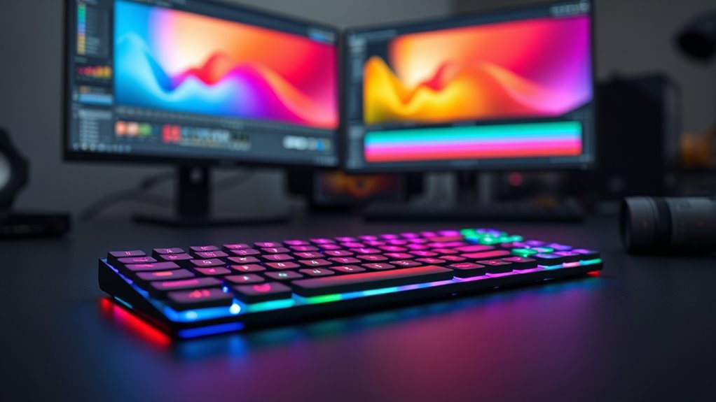 When choosing a caption keyboard shortcut pad, I focus on compatibility with my software to guarantee smooth integration. I also consider surface material quality and size for comfort and portability, along with durability and ease of maintenance. Finally, I look for a design that provides quick access to shortcuts to boost my workflow efficiently.