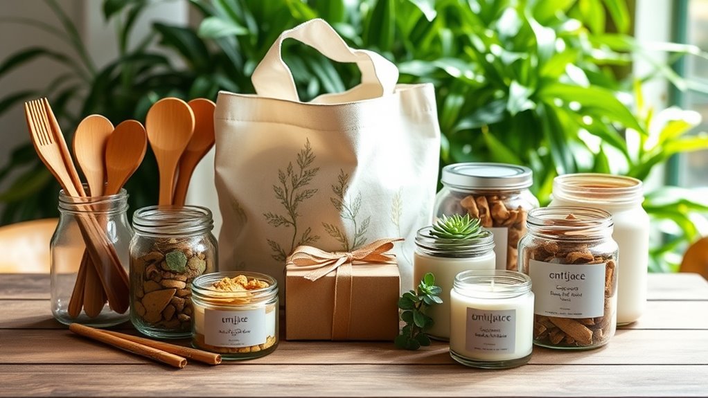 Choosing sustainable materials is essential when selecting eco-friendly gifts in 2025. I focus on materials like bamboo, recycled wood, organic cotton, and biodegradable seed paper because they minimize environmental impact. Products made from non-toxic, natural, or recycled resources promote sustainability and reduce pollution. Certified organic fabrics and plant-based bioplastics are excellent choices, ensuring the gift is both safe and ethically sourced. Using renewable resources and avoiding plastics or synthetic fibers helps support eco-conscious manufacturing practices. Incorporating biodegradable or compostable materials guarantees that the gift will break down naturally without harming ecosystems. By prioritizing these sustainable materials, I can give meaningful gifts that contribute to a healthier planet while aligning with eco-friendly values.