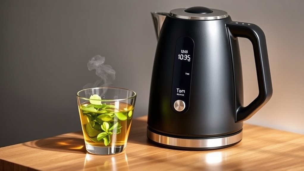 Like a knight in shining armor, these kettles are surprisingly energy-efficient during temperature adjustments. I’ve noticed they use just enough power to reach your desired temp without wasting energy, much like a well-trained squire. This means I save on electricity bills and reduce my carbon footprint. So, whether I’m brewing tea or coffee, I stay eco-friendly while enjoying perfect, precise temperatures every time.