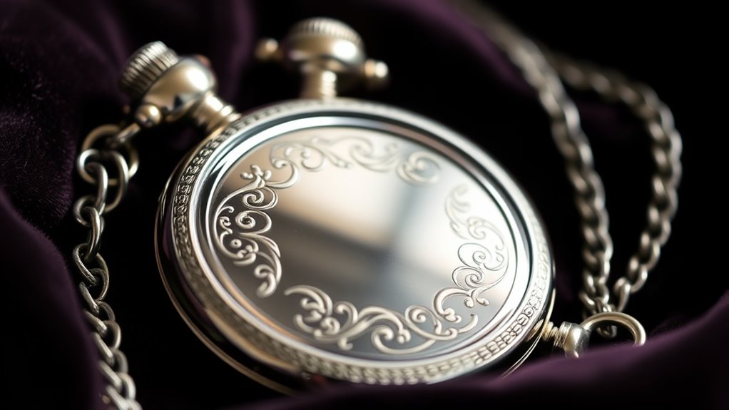 Selecting an engraved pocket watch that suits the recipient’s style involves carefully considering its overall aesthetic and how it complements their personal or formal attire. I recommend matching the watch’s design—whether vintage, classic, or modern—to their taste. Pay attention to details like dial color, case material, and engraving style to guarantee harmony with their preferences. For formal occasions, an elegant gold finish works beautifully, while a rugged metal style suits casual, everyday wear. Consider the size and shape too; a slim, minimalist watch might suit someone with a sleek wardrobe, whereas ornate designs are better for those who enjoy decorative accessories. Finally, ensure the watch aligns with other jewelry or accessories they typically wear, creating a cohesive, personalized look.