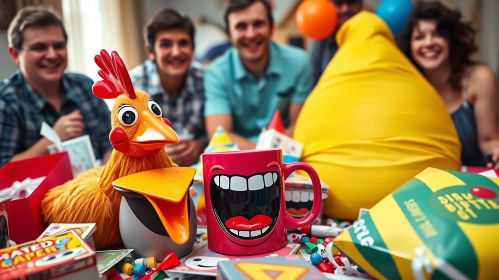 I find that gag gifts like humorous coffee mugs, funny desk signs, or quirky stress balls can promote positive humor without offending anyone. I choose items that are light-hearted and inclusive, avoiding anything that could be misinterpreted. These gifts spark smiles and laughter, creating a fun atmosphere. When I pick gag gifts thoughtfully, they bring joy and camaraderie without crossing any lines.