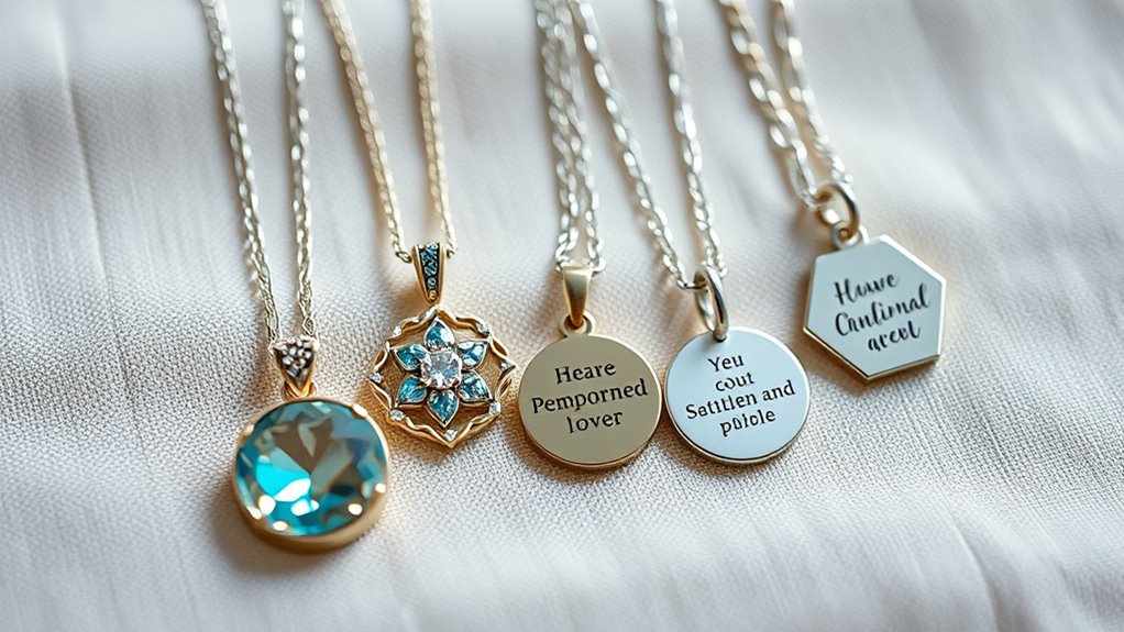 When selecting an inspirational necklace for a specific occasion, it’s important to guarantee its design and message suit the event’s tone and setting. For formal events, opt for delicate symbols like small charms or subtle engravings that complement elegant attire. In casual settings, bold statements or meaningful motifs like crosses or hearts can express personality and support. Consider if the symbolism aligns with the occasion—religious symbols for faith-based gatherings or supportive messages for milestones. Match the material and style to the event’s formality; sterling silver works well daily, while gold plating suits special celebrations. Also, ensure the message or engraving reflects the event’s purpose—whether to inspire, support, or commemorate—making the necklace truly meaningful.