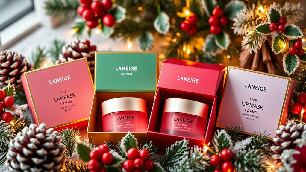 Have you considered how the flavor options of Laneige Lip Mask holiday sets can influence your overall experience? Picking a flavor that suits your taste preferences, like mint, grapefruit, coconut, or berry, can make your lip care routine more enjoyable. Different flavors offer unique sensory experiences—mint provides a invigorating burst, while fruit flavors like berry or grapefruit deliver a sweet, fruity aroma. When you enjoy the scent and taste, you’re more likely to use the mask consistently, maximizing its benefits. Some sets even include variety packs with multiple flavors, allowing you to experiment and find what works best for you. Ultimately, choosing a flavor you love can turn lip care into a delightful, festive treat.