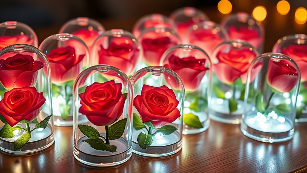 LED roses in glass domes typically last between 25,000 to 50,000 hours, which means they can stay glowing for several years with proper care. I’ve found that they’re quite durable and energy-efficient, so I don’t worry much about replacing them often. Just make sure to keep the glass clean and avoid harsh impacts, and your romantic centerpiece will shine beautifully for a long time.