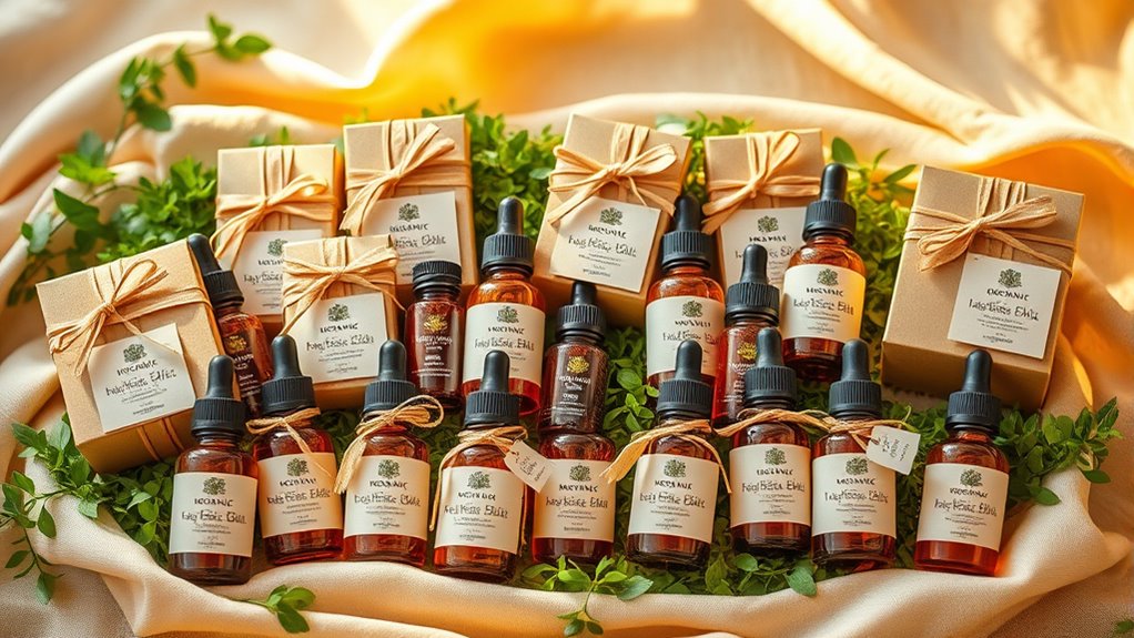 Choosing massage-oil gift sets with reputable organic certifications guarantees you’re getting products made without synthetic chemicals, pesticides, or GMOs. Certifications like USDA Organic ensure strict adherence to standards that prioritize soil health, ingredient purity, and safe manufacturing practices. These labels require that oils contain at least 95% organic ingredients, providing confidence in their natural origin. Regular audits and third-party testing by certifying bodies help maintain ongoing compliance, so you know the product’s integrity is upheld over time. Opting for certified organic oils not only promotes safety and reduces exposure to harmful residues but also supports environmental sustainability. When selecting a gift set, always check for recognized certifications to guarantee you’re giving a truly organic, high-quality product that aligns with your values.