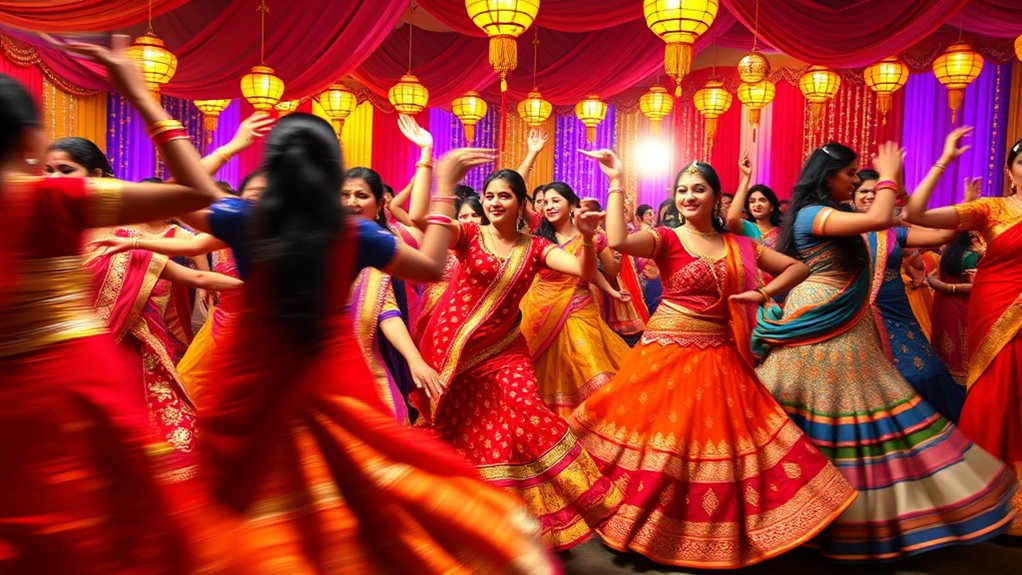 To make your Navratri dance truly eye-catching, focus on selecting sticks with designs that reflect traditional themes and festival aesthetics. Vibrant colors and intricate patterns can enhance the visual appeal and resonate with the festive spirit. Embellishments like ribbons, bells, lace work, or metallic accents add extra sparkle and movement during your performance. The choice of materials, such as polished wood or decorated metal, impacts the overall look and lends authenticity. It’s essential that decorative elements are securely attached to avoid detachment during vigorous dancing. Additionally, your personal style and the overall theme of the celebration should guide your selection, ensuring a cohesive and striking visual impact. Thoughtful design choices make your dance more lively and culturally rich.