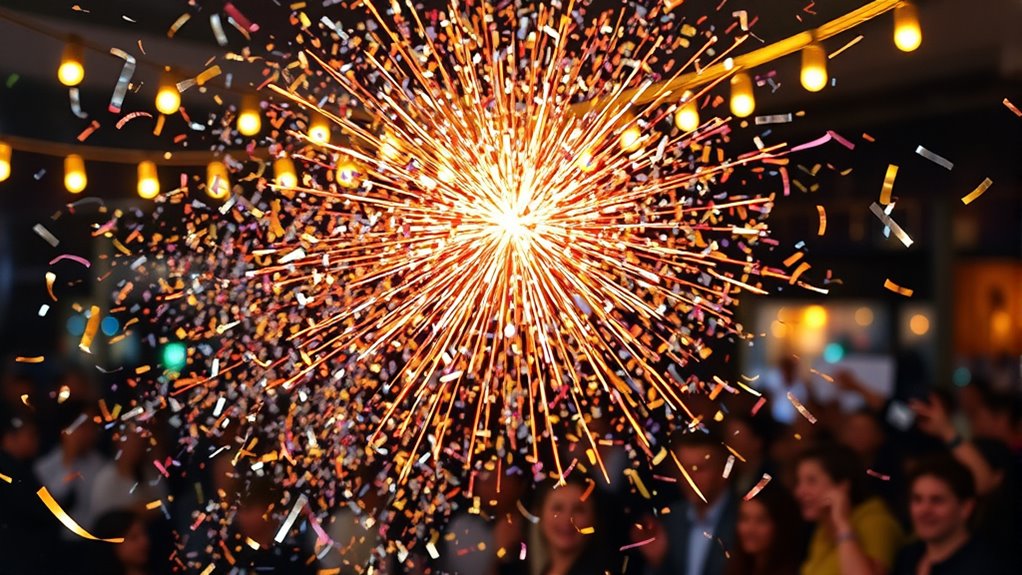 If you want to make your New Year’s Eve celebration unforgettable, I recommend trying a variety of confetti cannons that create spectacular visual effects and heighten the excitement. Options like the PrimePure 8 Pack, YESHOW 6 Pack, or the biodegradable versions offer vibrant colors, large bursts, and elegant designs perfect for any event. With different pack sizes and eco-friendly choices available, there’s something for everyone. Keep going to discover the top choices that will elevate your party to the next level.