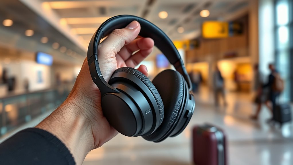 When selecting noise-canceling headphones for travel, their portability and weight can considerably impact your overall experience. Lighter headphones, typically under 0.7 pounds, are more comfortable for long sessions, preventing fatigue. Foldable or collapsible designs make packing easier by reducing size, fitting neatly into your carry-on. Using a compact, travel-friendly case protects your headphones from damage and keeps them organized. Headphones with ergonomic, adjustable headbands offer a secure fit without adding extra weight or bulk. Wireless models with long battery life eliminate the need for carrying extra cables or chargers, simplifying your packing. Prioritizing lightweight, portable headphones guarantees they’re easy to carry, comfortable during extended wear, and ready for hassle-free travel.