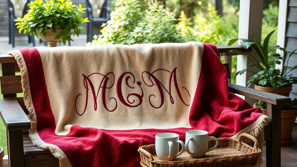 Personalization options play a crucial role in making a couples blanket truly special and meaningful. You can customize these blankets with names, initials, wedding dates, or heartfelt messages to create a one-of-a-kind keepsake. Many options also let you add photos—favorite images of the couple, pets, or memorable moments—adding emotional depth. Unique design elements like monograms, themed artwork, or personalized motifs further enhance the blanket’s uniqueness. The customization methods vary from embroidery and woven monograms to printed graphics, giving you a range of aesthetic choices. Keep in mind that the level of personalization differs across products; some allow multiple custom fields, while others focus on specific themes. Choosing the right options ensures your blanket will be a cherished, personalized reminder of your bond.
