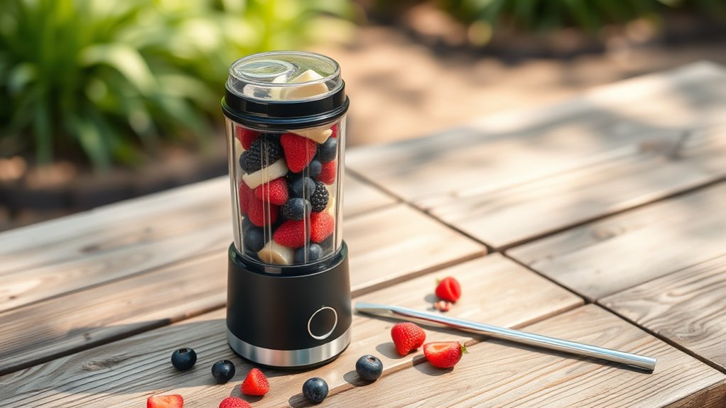 A portable blender’s battery life is a crucial factor to contemplate, especially if you plan to use it outdoors or on the go. Longer battery life means more blending cycles without needing a recharge, which is perfect for extended outdoor use. I recommend looking for models with at least 2000mAh capacity to guarantee enough power for multiple sessions. Fast charging features are a game-changer, as they reduce downtime and let you quickly get back to blending. Many blenders also include indicators or LED lights to show remaining battery life, helping you plan your use better. Keep in mind that battery life varies depending on motor power and blending intensity; high-powered models tend to drain batteries faster. Choosing the right duration ensures you won’t be caught without power when you need it most.