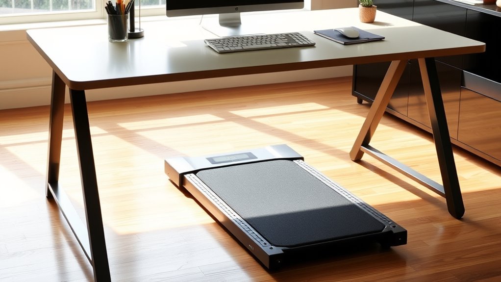 Choosing the right portable under-desk treadmill isn’t just about features or price; it’s about balancing convenience with comfort. Like a steady companion that keeps you moving, the perfect treadmill fits seamlessly into your workday without distraction. It’s easy to overlook small details, but these make all the difference—turning a simple workout into a sustainable habit. Remember, the best treadmill isn’t just portable; it’s the one that seamlessly integrates into your busy life.