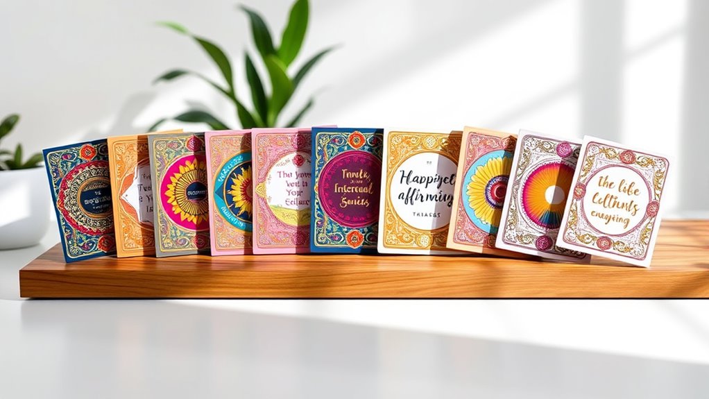 Choosing the right affirmation deck feels like discovering a secret weapon for confidence—think of it as my modern-day talisman, much like a knight’s armor in an age of dragons. Whether you seek mindfulness, faith, or daily motivation, these decks can truly transform your mindset. Remember, it’s not just about the cards, but the magic within you. So, pick one that resonates, and let your journey to self-love and empowerment unfold—time, after all, is still the greatest healer.