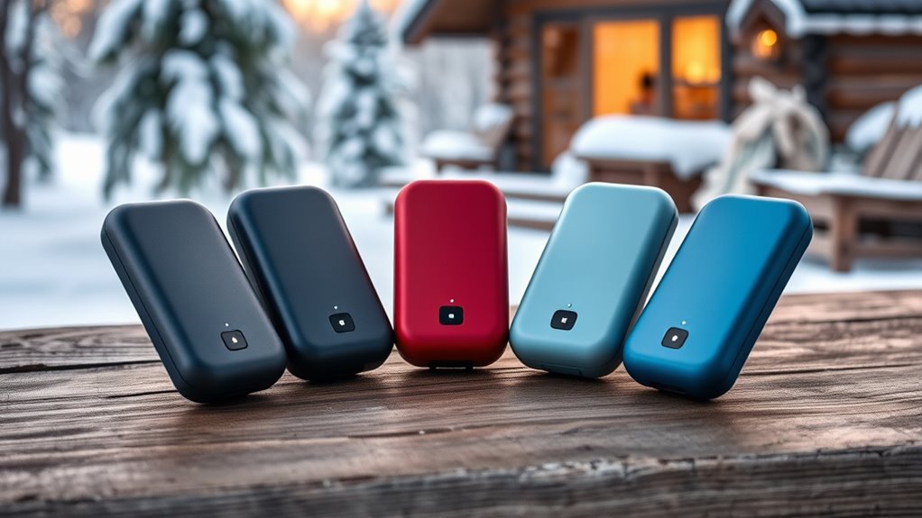 Safety certifications and protections are vital considerations to guarantee your rechargeable hand warmer operates reliably and safely. Look for certifications like UL, CE, or FCC, which confirm the device meets established safety standards. Built-in protections such as overheat, overcharge, overvoltage, and short-circuit prevention are essential for avoiding malfunctions and potential hazards. An automatic shut-off feature is also important, as it prevents overheating during extended use. Additionally, ensure the hand warmer uses high-quality lithium batteries with certified safety ratings, reducing the risk of fire or malfunction. Multiple safety systems and certifications provide peace of mind, guaranteeing your device is dependable in various conditions. Prioritizing these protections helps you enjoy warmth without worrying about safety risks.