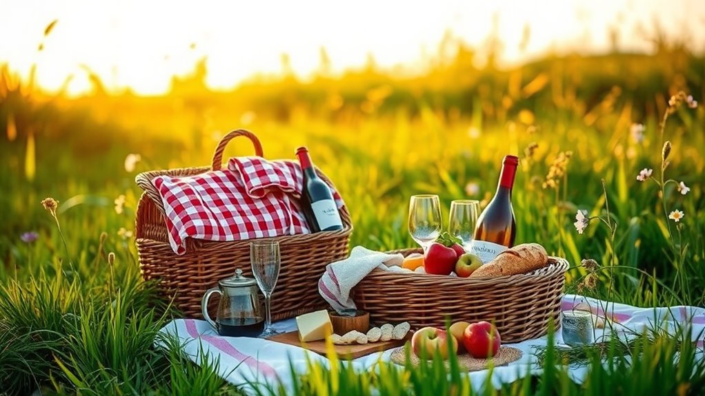 If you’re looking to elevate your outdoor date night, I’ve got you covered with the 15 best romantic picnic-basket sets. These sets combine style, durability, and thoughtful features like insulated compartments, complete tableware, and charming designs perfect for couples or small groups. From vintage wood to wicker baskets, each option guarantees easy transport and adds a special touch to your romantic moments. Keep exploring to discover the perfect fit for your memorable outdoor experience.