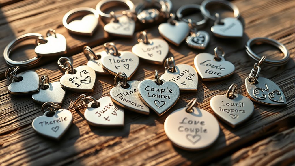 Personalization options play a essential role in selecting sentimental keychains for couples because they add a meaningful touch that reflects the unique bond shared between partners. I find that initials, names, dates, or custom messages instantly make a keychain special, turning it into a cherished keepsake. Custom engravings or added charms allow for a personal expression of love and shared memories. Some keychains even offer interchangeable components, giving you the flexibility to update or customize them over time. Whether through laser engraving, printing, or attaching meaningful symbols, each personalized detail makes the gift one-of-a-kind. Choosing a personalized keychain shows thoughtfulness and helps strengthen emotional bonds by highlighting the recipient’s personality or shared experiences, making the gift truly memorable.