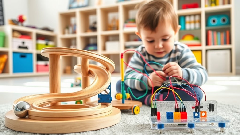 Selecting the right STEM toys for toddlers means focusing on those that foster critical thinking, problem-solving, and creativity, which are essential for early cognitive growth. I look for toys that incorporate real-world concepts like engineering, physics, or coding, providing meaningful educational experiences. It’s important they’re age-appropriate, with clear learning objectives that challenge yet remain accessible. Toys should encourage hands-on exploration and tactile engagement, helping to develop fine motor skills and sensory awareness. I also consider whether the toys include measurable educational outcomes, such as understanding basic scientific principles or enhancing spatial reasoning. These factors ensure the toys not only entertain but also deliver valuable learning opportunities, laying a strong foundation for future academic interests and curiosity.