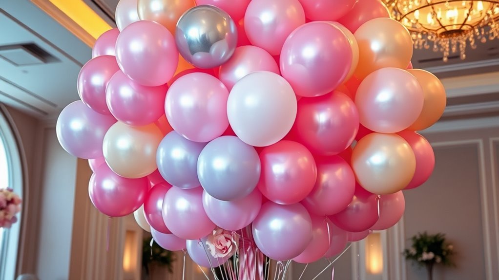 Choosing the right balloon colors is vital for creating a cohesive and stylish Sweet Sixteen celebration. I recommend sticking to a consistent color palette, like pink, gold, or rose gold, to give your decor an elegant, unified look. Incorporate complementary shades such as white or champagne to add contrast and depth, keeping everything harmonious. Matching balloon colors to your party theme or other decor ensures a polished aesthetic. For extra visual interest, consider metallic or confetti balloons in coordinating hues to introduce sparkle and texture. Planning your color scheme ahead of time is essential—gather sample swatches or images to visualize how the colors work together before making your purchase. This approach guarantees a cohesive, stunning atmosphere for your special day.