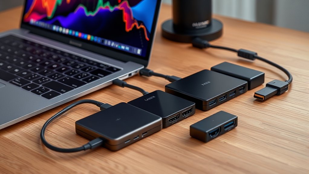 When choosing a USB-C hub for professional video editing, I always look for one that’s future-proof and reliable. You need a hub with high-speed Thunderbolt 3 or 4 support, plenty of fast USB ports, and multiple HDMI or DisplayPort outputs for multiple monitors. Don’t forget to check power delivery to keep your laptop charged. In this game, you’ve got to be on your toes to get the best performance.
