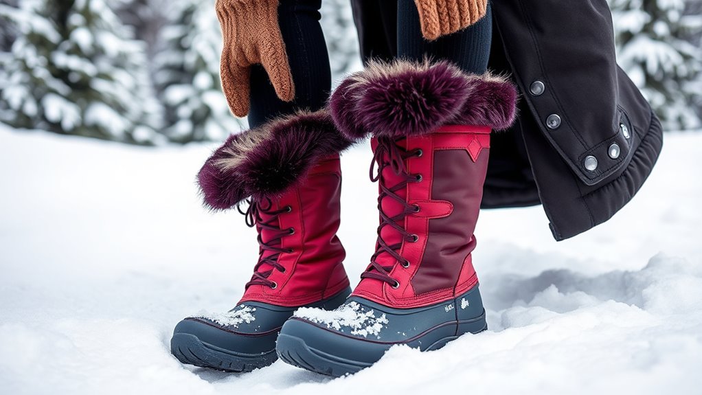 The waterproof material of snow boots keeps your feet dry, but staying warm depends heavily on the insulation inside. Effective insulation materials like Thinsulate, faux fur, or wool trap body heat, ensuring warmth in cold conditions. The thickness and density of insulation directly impact how warm your boots will be; higher grams mean more insulation. A plush fleece or fur lining adds comfort and extra thermal protection, preventing heat from escaping through the boot’s upper, shaft, or sole. Layered insulation combined with waterproof barriers works together to keep your feet dry and cozy during prolonged exposure to snow and cold temperatures. Choosing boots with the right insulation guarantees your feet stay warm, even when winter weather is at its harshest.