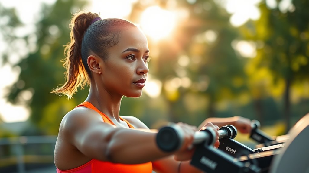 You can track your progress effectively by using progress journaling to log your workouts, goals, and improvements regularly. Incorporate wearable devices like fitness trackers to monitor your steps, heart rate, and calories burned, giving you real-time data. Combining these tools helps you stay motivated, see tangible results, and make adjustments to your routine, ensuring you stay on course toward your fitness goals.