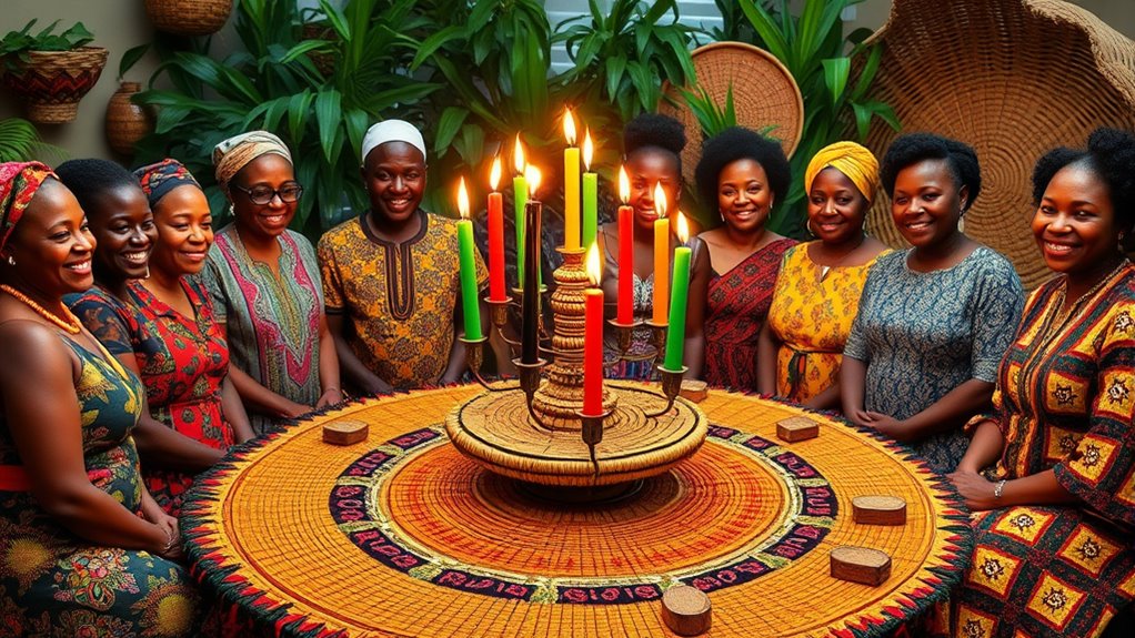 You’ll find that many Kwanzaa celebrations include the use of woven mats, called mkeka, which symbolize tradition and respect for African heritage. Placing the kinara on the mkeka creates a visual connection to the continent’s cultural symbols and traditions. You might also include baskets, crops, or artwork inspired by African motifs to further emphasize the connection to African culture. These symbols serve as a visual reminder of the history and resilience of African ancestors, fostering a sense of pride and continuity.