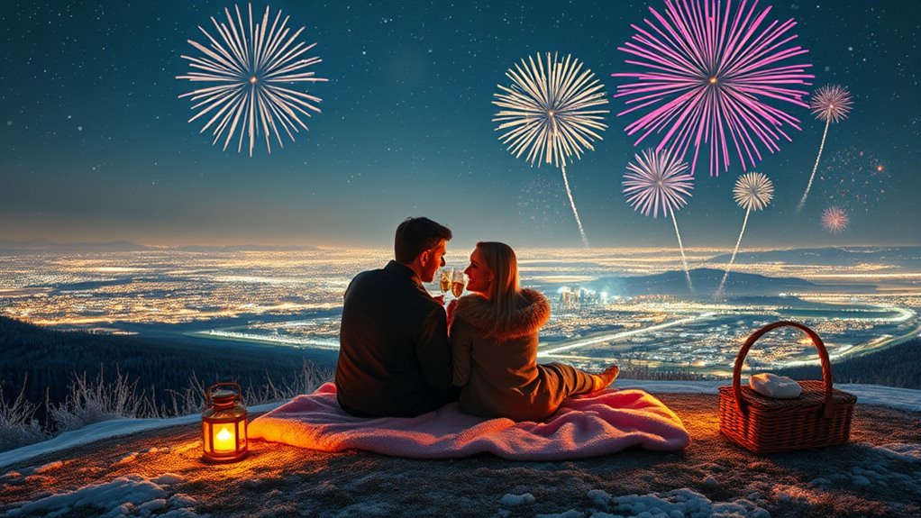 For a romantic New Year’s Eve to remember, consider cozy cabin getaways surrounded by snow-covered trees and candlelight. Enjoy outdoor winter activities like snowshoe walks or scenic drives, then cozy up by a fireplace afterward. Host an elegant dinner with fairy lights and chase the midnight fireworks together, sharing dreams and champagne. Creating simple, heartfelt moments in a beautiful setting will make welcoming 2026 truly special—if you keep exploring, you’ll find even more inspiring ideas.