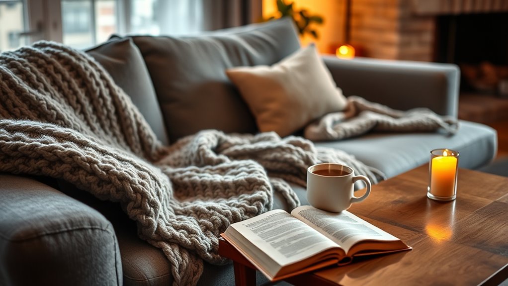 To improve your sleep after holiday celebrations, focus on good sleep hygiene by maintaining consistent sleep and wake times. Create a relaxing bedtime routine, such as reading or gentle stretching, to signal your body it’s time to wind down. Limit caffeine and screen use before bed, and confirm your sleeping environment is cool, dark, and quiet. These habits help reset your sleep schedule and promote restful, restorative sleep.