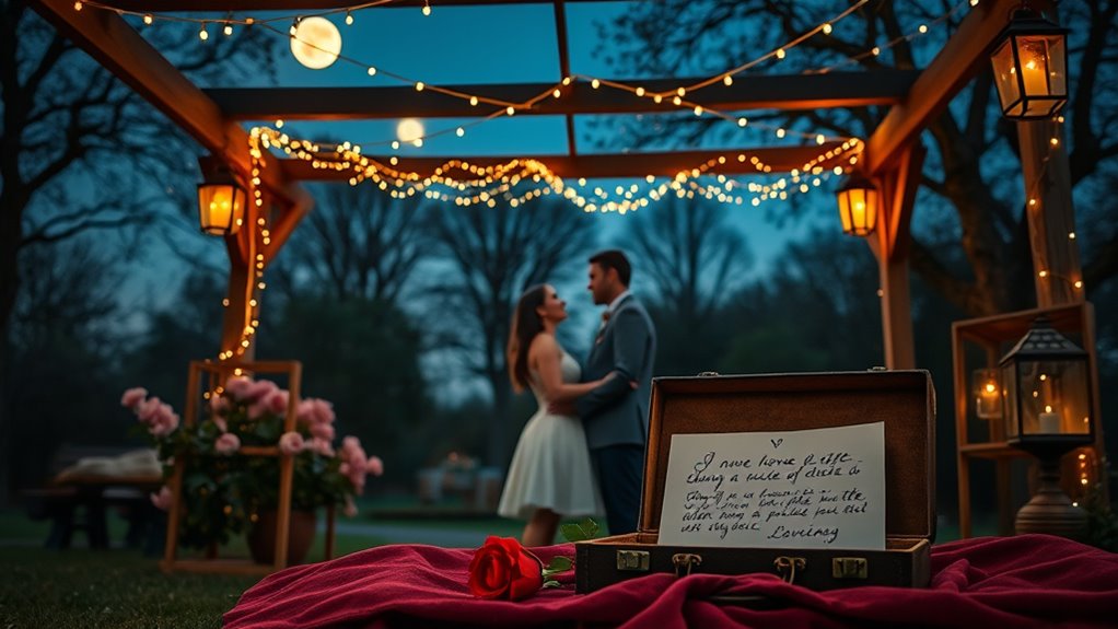 Did you know virtual date ideas can create meaningful moments across distances? For a unique proposal, plan a virtual movie night or online game session, then surprise your partner with personalized proposal gifts like custom jewelry or heartfelt letters. You can also incorporate a virtual scavenger hunt or a shared playlist. These thoughtful gestures bridge the gap, making your proposal memorable and heartfelt despite the miles between you.