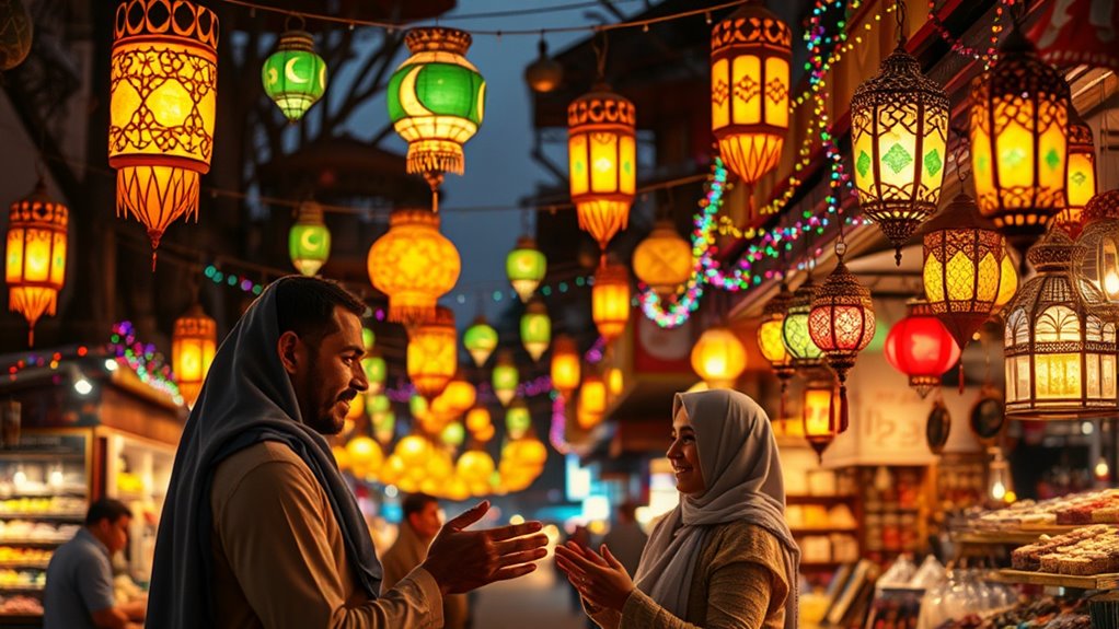 Cultural celebrations during Ramadan are vibrant expressions of faith and community. As you exchange greetings, remember that these festivities often include communal Iftars, charity events, and cultural displays that bring people together. In many regions, families and neighbors gather to break their fast, sharing traditional foods that carry deep-rooted significance. These gatherings are more than just meals—they’re opportunities to strengthen bonds, celebrate heritage, and spread kindness. When you send Ramadan wishes, consider acknowledging the beauty of these cultural celebrations, emphasizing the importance of unity and shared traditions. Whether you’re familiar with the customs or learning about them for the first time, your heartfelt words can honor the diversity and richness of Ramadan’s cultural tapestry.