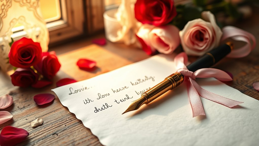 To create the perfect love letter, focus on honesty and heartfelt emotion. Speak from your true feelings, highlighting what truly moves you about your partner. Use simple, poetic imagery like sunsets or guiding stars to deepen your message. Personal touches—shared memories or inside jokes—make it unique. Keep your words sincere and clear, avoiding clichés, so your partner feels genuinely valued. If you keep exploring, you’ll discover how to craft a letter that’s both meaningful and unforgettable.